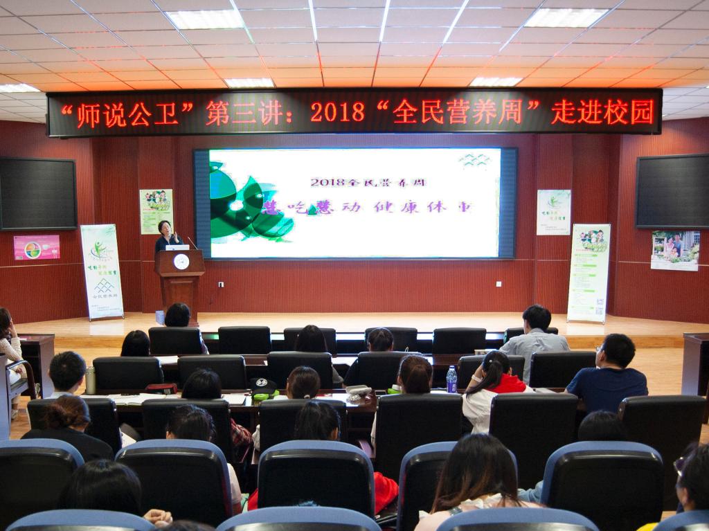 讲座伊始,刘娅教授首先调查了同学们对营养周的态度,并由此引出营养与慢性病状况的调查指标对国家社会经济发展、卫生保健水平和人口健康素质的重要意义。刘娅教授提到,习近平总书记曾在党代表会上提出的“健康中国”建设的主要指标,并指出“没有全民健康就没有全面小康”。刘娅教授详细介绍了膳食宝塔的含义,通过讲述“铁人”王进喜的故事,强调了膳食平衡的重要性。