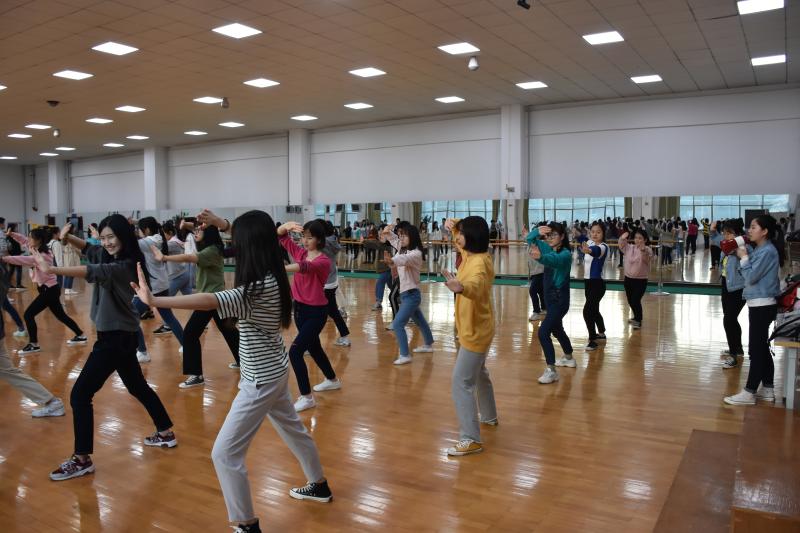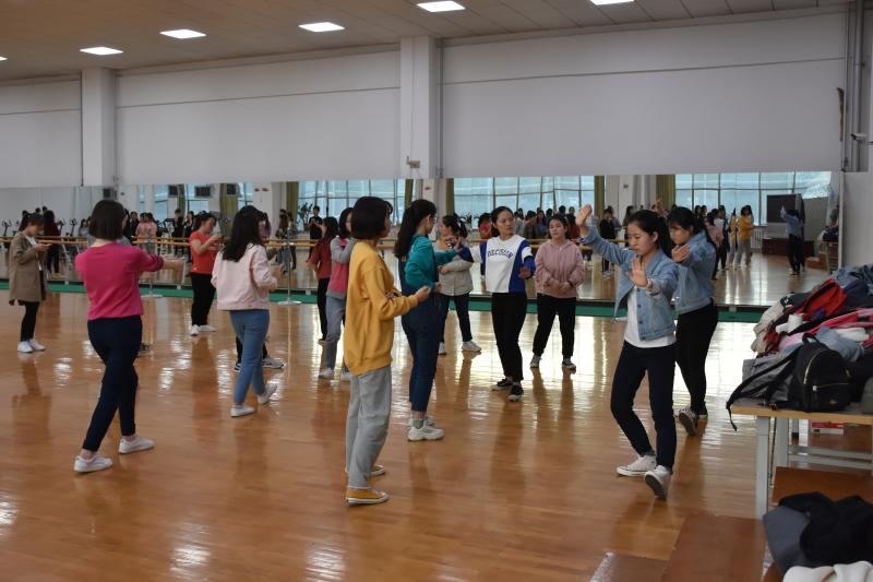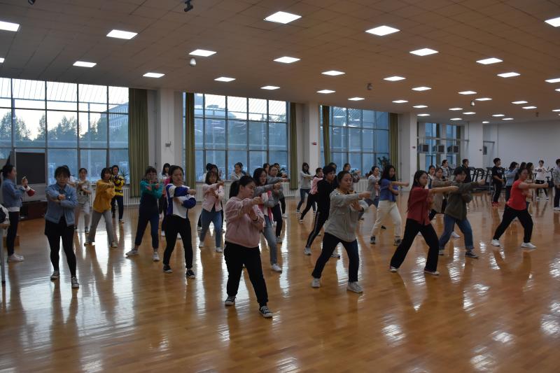 学生会学习部在吉林大学新民校区体育馆健美操室组织2017级32名同学进行太极拳集训。