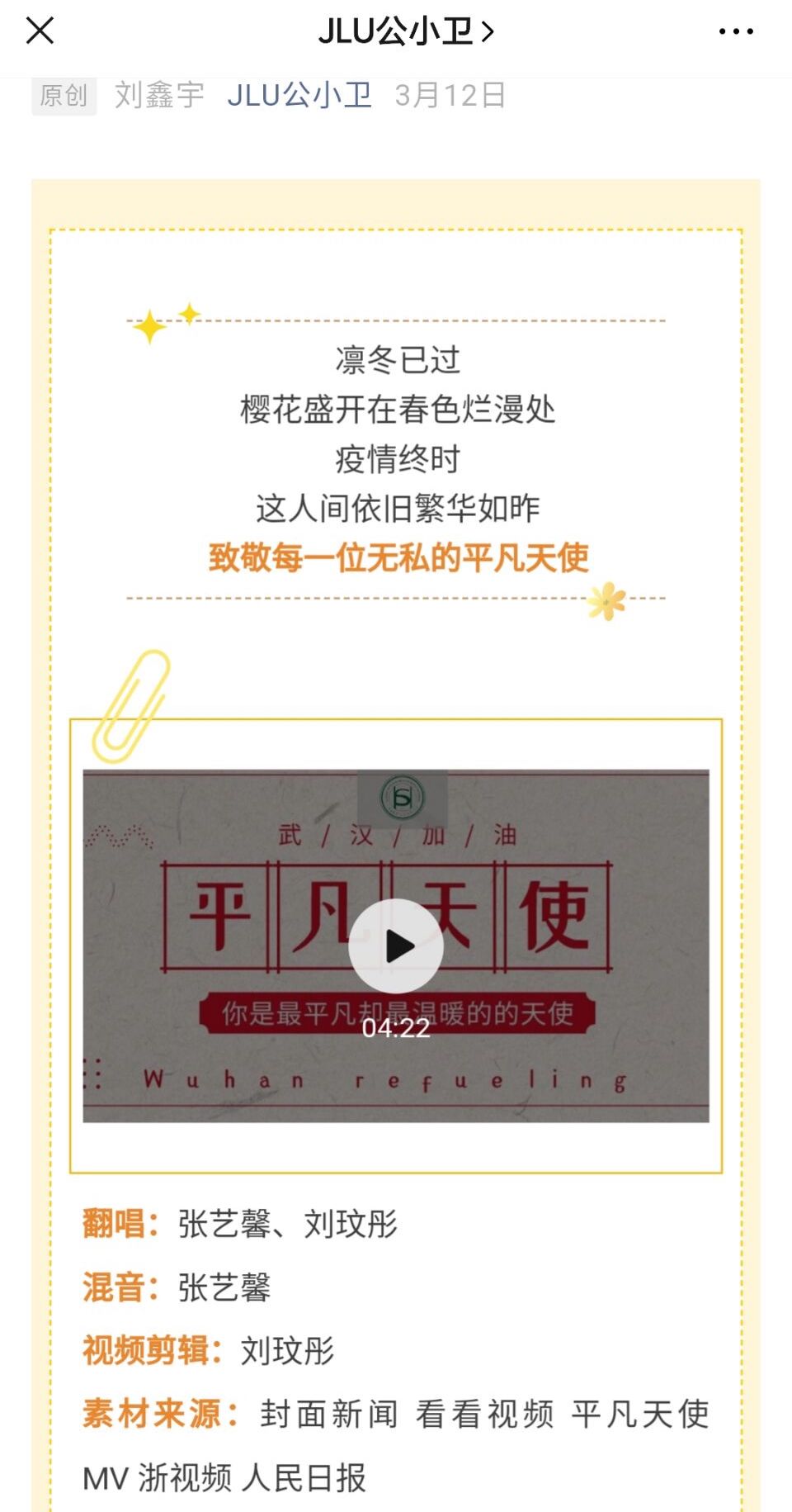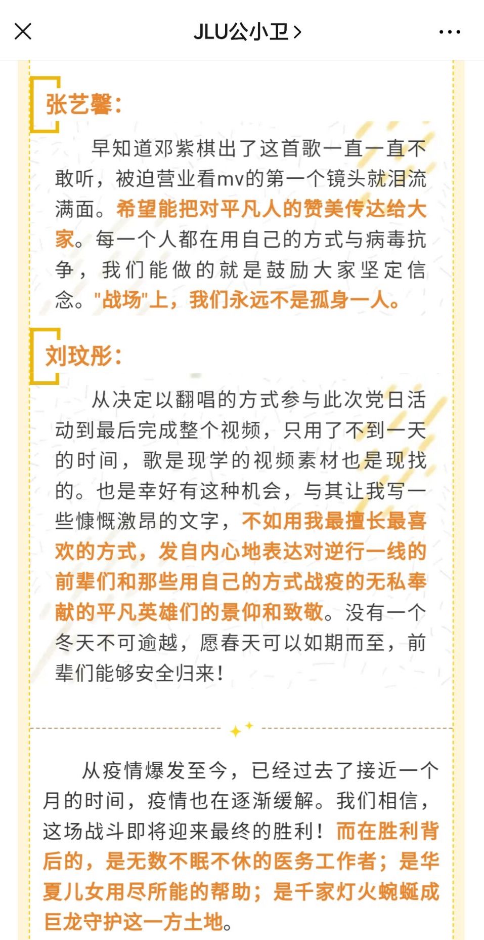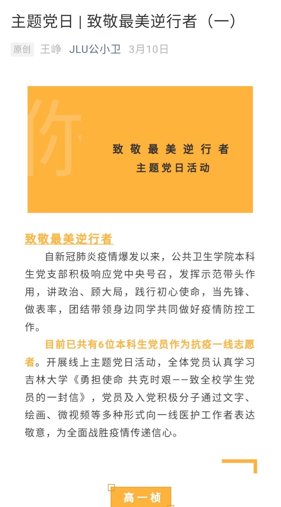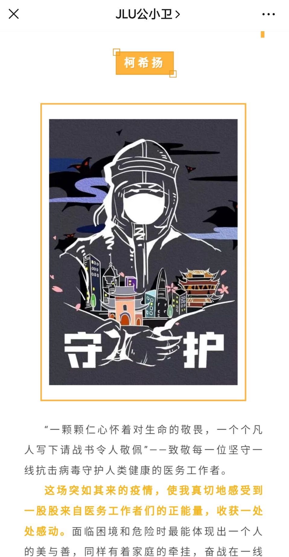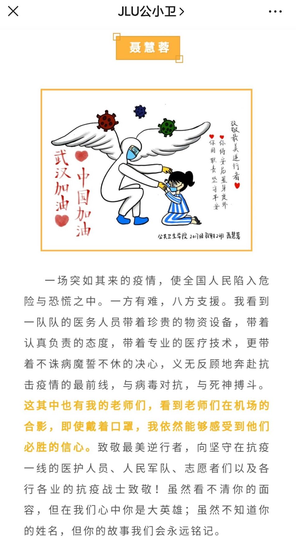 在本次活动中,支部党员及入党积极分子积极投稿,通过翻唱暖心歌曲、朗诵致敬诗歌以及创作文字、绘画和微视频等多种形式来表达对最美逆行者的崇高敬意。参加本次活动的作品经过最终遴选,发表在学院公众号JLU公小卫上。这些作品秉承着“疫情就是命令,防控就是责任”的信条,传递出党员们对各行各业抗疫战士的敬意与感谢,也表达了作为医学生“不忘初心,牢记使命”的责任与担当,获得了同学们的由衷赞美与一致好评。在线上,党员们还认真学习了吉林大学《勇担使命 共克时艰——致全校学生党员的一封信》,切实发挥好带头示范作用,团结带领身边同学共同做好疫情防控工作。