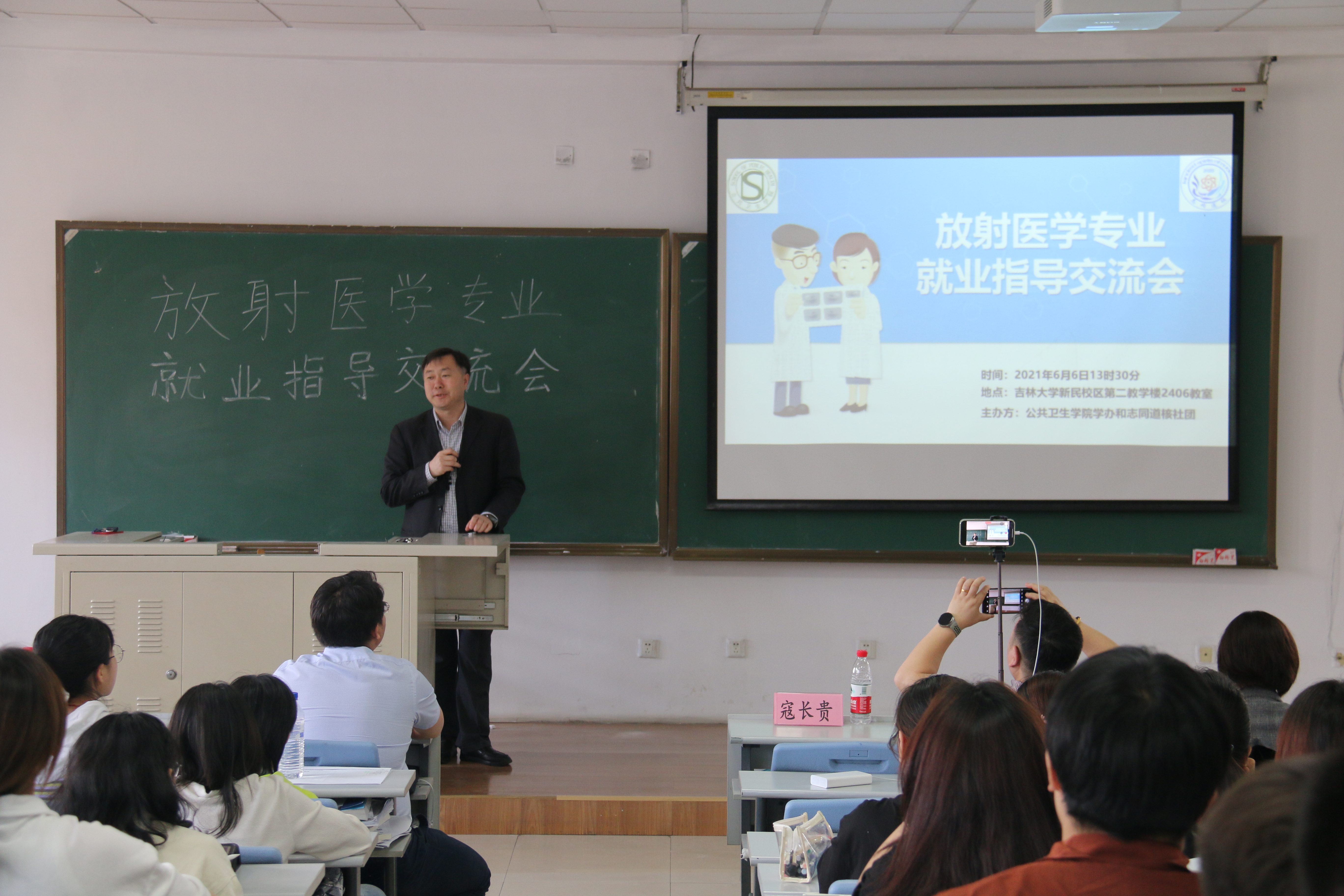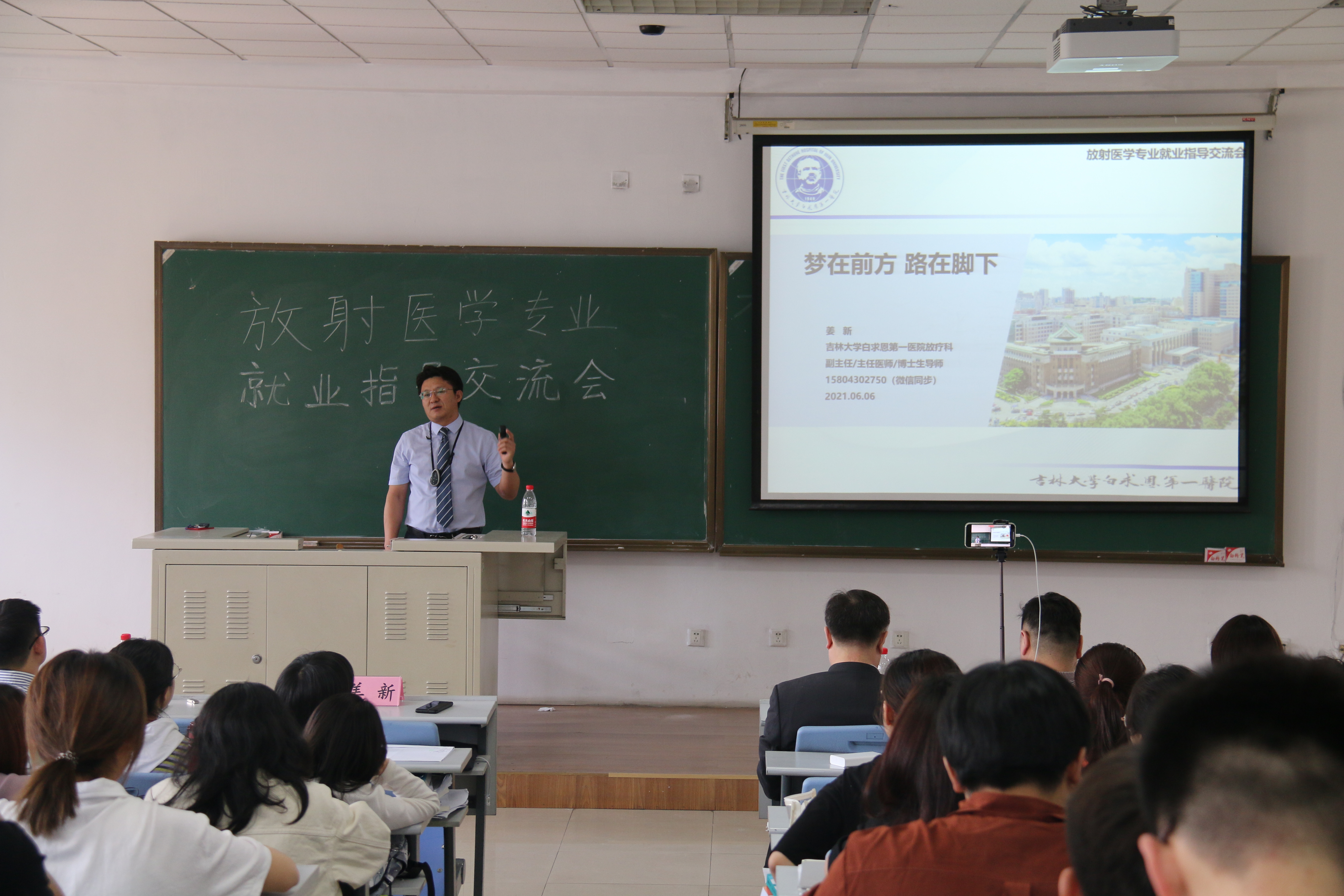 放射医学专业的本科建设目标,鼓励大家多多进行素质发展,共同努力将放射医学专业发展为吉林大学的一张名片。而后他向在场所有同学表示了美好的祝愿,希望大家都能成功考研、就业。随后,姜新、申延年、王辉东、陈滨、王志佳几位老师分别上台,就为什么要有就业指导,就业指导应该着重考虑的问题、放射医学专业未来毕业面临的方向等方面进行了详细的讲述。姜新老师强调了英语在学术交流中的重要性,希望同学们能够重视英语的口语和翻译。几位老师还着重讲述了放射医学专业考研的形势以及就业求职的方向和注意事项,并指导大家正确认识自己,鼓励大家选择自己热爱、适合的方向继续前行。最后,几位老师也纷纷表达了对同学们的祝愿,在同学们的掌声中,本次交流会圆满结束。