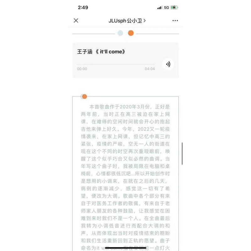 此次线上文艺活动中,同学们围绕抗击疫情,共克时艰主题踊跃参与,演唱具有时代特色、动人力量的暖心歌曲,多首翻唱歌曲点亮了疫情封寝期间的枯燥生活,如樊奕良、蒋瀚鸿同学翻唱的歌曲《明天会更好》,通过平和而热切的音调,表达了大家期盼疫散花开的美好心愿。谭晓辉同学翻唱的歌曲《你要相信这不是最后一天》同样也表达出了同学们发自内心的美好、温暖与力量。王子涵同学在两年前武汉疫情期间自行创作的英文歌曲《It will come》,在当下疫情紧张时刻,又激发出新的感受与感动。此外,还有很多优秀音频和视频作品通过旋律向我们传达着疫情期间的温暖、希望和力量。