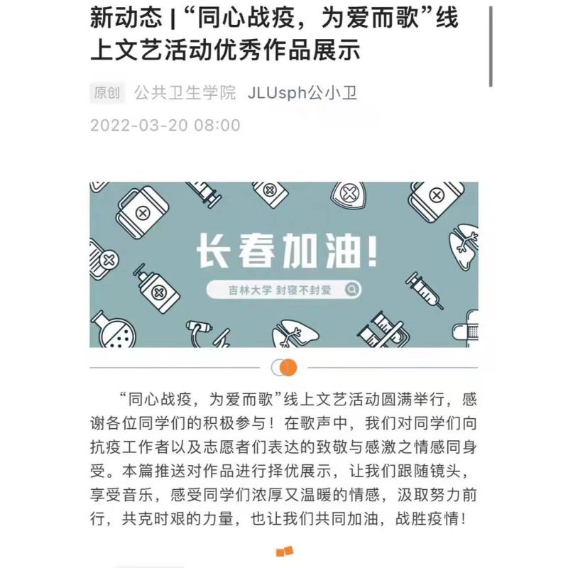学生会文艺部于疫情期间举行“同心战疫,为爱而歌”线上文艺活动,大家积极参与,释放压力,反响热烈。